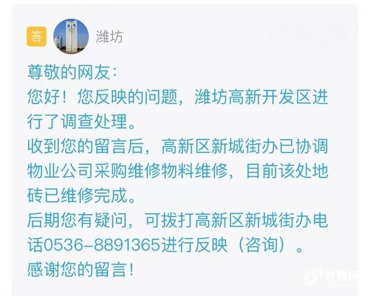 收到留言后,潍坊高新开发区进行了查询处理。高新区新城街办已和谐物业公司收购修理物料修理,现在该处地砖已修理完结。