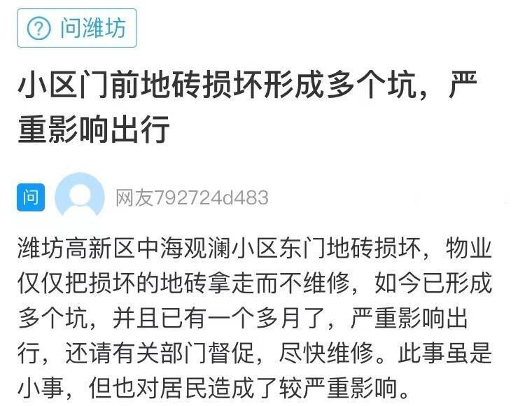 一位潍坊网友在《问政山东》网络问政渠道留言说:潍坊高新区中海观澜小区东门邻近地砖损坏严峻,物业虽已移除破损地砖,却迟迟未做修理,导致地上呈现多个坑洼。此状况已继续一个多月,给居民出行带来极大不方便与安全隐患。恳请有关部门催促物业赶快修正,保证小区环境与居民安全。